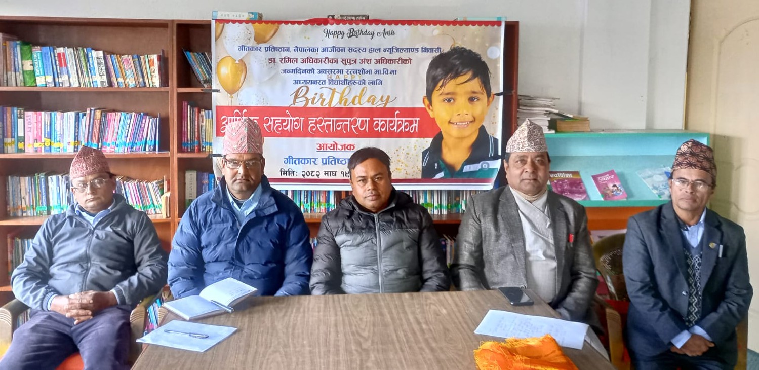 कार्यक्रममा विद्यालयका प्रधानाध्यापक कृष्णप्रसाद पौडेललाई रकम हस्तान्तरण गरिएको थियो । प्रधानाध्यापक पौडेलले विद्यार्थीका लागि गरिएको सहयोगप्रति धन्यवाद ज्ञापन गरे ।
